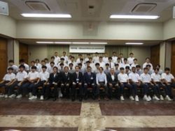 第76回関東中学校ラグビーフットボール大会で第3位の成績を収めた熊谷合同(大幡・奈良・吉岡)の代表選手が、他校、他種目の選手たちとともに市長を訪問し、大会報告をしました。市長、教育長のお二人から、ねぎらいと激励の言葉をいただきました。「進め、明日のその先へ」
